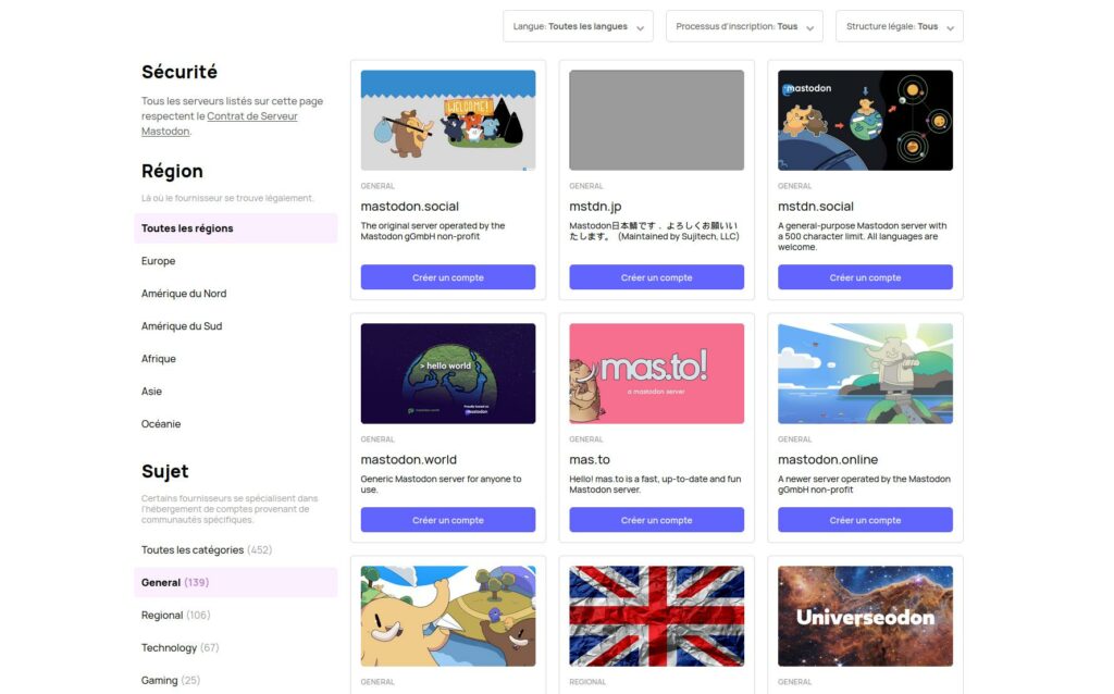 Retrouvez une liste très complète des instances libres à l’inscription sur JoinMastodon. Vous pouvez filtrer par région, sujet ou choisir la langue principale utilisée sur le réseau.