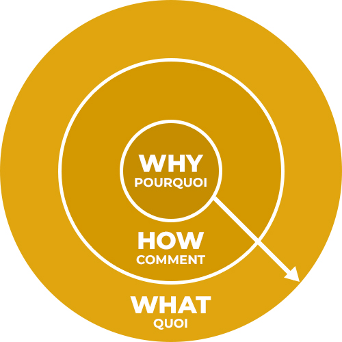 La plupart des entreprises savent ce qu’elles font (le Quoi), certaines savent comment elles le font (le Comment), mais très peu savent pourquoi elles le font (le Pourquoi). Les entreprises qui réussissent sont celles qui communiquent de l’intérieur vers l’extérieur du cercle, en commençant par le Pourquoi.